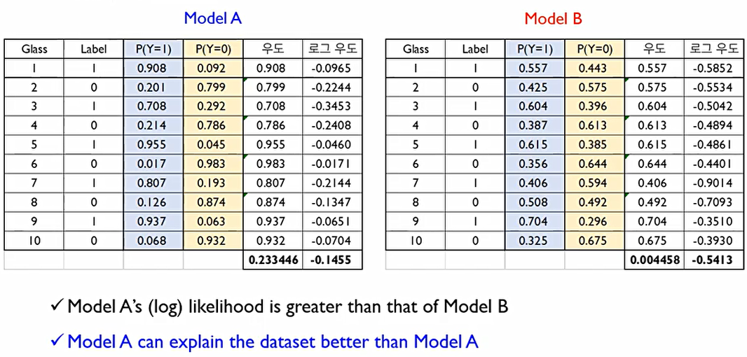 그러나, 우도값은 기본적으로 0에서 1사이의 값이기에 개체가 많아질수록 0에 가까워진다. 이에 이를 해결하기 위해 로그우도 값을 사용한다.