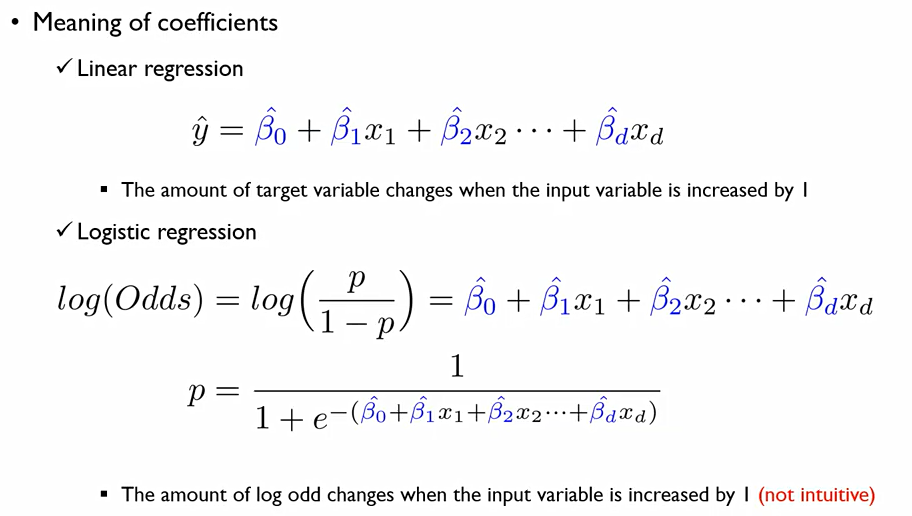 그러나, 오른쪽 회귀식을 유지함으로써 우리는 각각 회귀변수가 통계적으로 얼마나 유의미한지 판단할 수 있고(Ability to find significant variables), 해당 설명 변수가 증가하느냐 감소하느냐에 따라 성공확률 또는 특정 범주에 속할 확률이 증가하는지 감소하는지(explainability)를 알 수 있다.