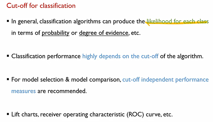 지금까지 설명한 Measure들은 모두 confusion matrix때문에 cut-off라고 하는 분류 기준점에 영향을 받는다. 즉, Measure들은 cut-off에 종속적이다.