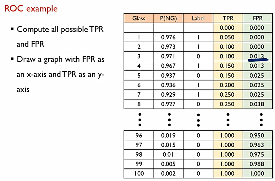 이렇게 처음부터 cut-off를 계산하여 마지막까지 계산하면 TPR과 FPR의 101개의 조합이 나온다.