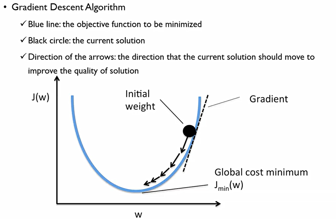 여기서 Gradient는 접선의 기울기를 말한다. 이 Gradient의 부호에 따라 우리는 최적점을 찾아갈 수 있다. 이것이 0이 아닐 경우 우리는 최적점에 있지 않은 것이고, 최적점에 가려면 어디로 가야하느냐에 대한 방향에 대해 정보를 얻을 수 있다.