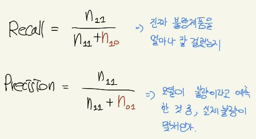 이때 Balanced correction rate(BCR)이라는 값이 존재한다. 다음의 예시에서 ACC는 0.999의 값이 나오지만, 실질적으로는 불량을 단 한건도 판단하지 못한 의미없는 모델이다.