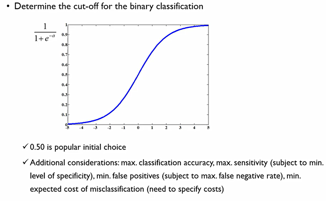 확률값을 0.5를 기준으로 이보다 높으면 1, 아니면 0인 것. 그러나 기준점(cut-off)은 각자 Task에 따라 맞춰 사용해야 한다. 사전 확률이 낮으면 이에 따라 cut-off값도 낮춰줘야 한다(제조업의 불량개체 확인). 반대일 경우는 높여주지만, 이러한 경우는 거의 없다.