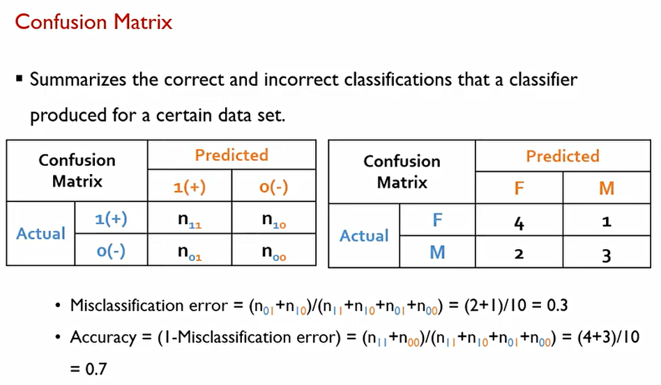 이때, Misclassification error는 보통 대각행렬이 아닌 부분/전체 값으로 구할 수 있고, Accuracy는 대각행렬 값/전체 값으로 구할 수 있다.