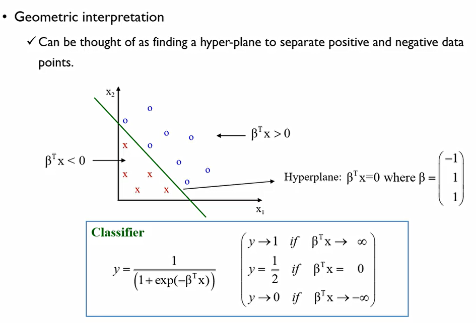 그렇다면 Logistic regression이 기하학적으로 무슨 의미를 가지는 것일까? 2개의 설명변수로 이루어진 범주가 있다. 이를 가장 잘 구별하는 직선을 찾는 것. 2차원일 경우는 직선, 3차원일 경우는 평면.. 등으로 넘어간다. 초평면을 찾는다고 표현한다.