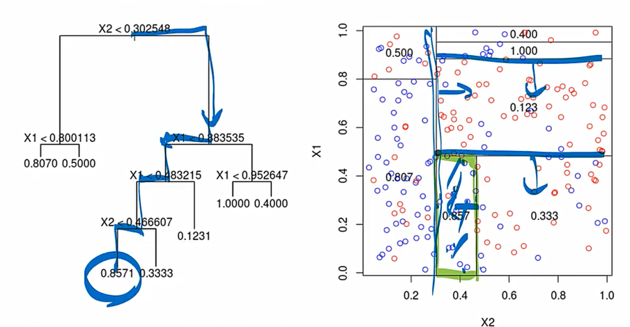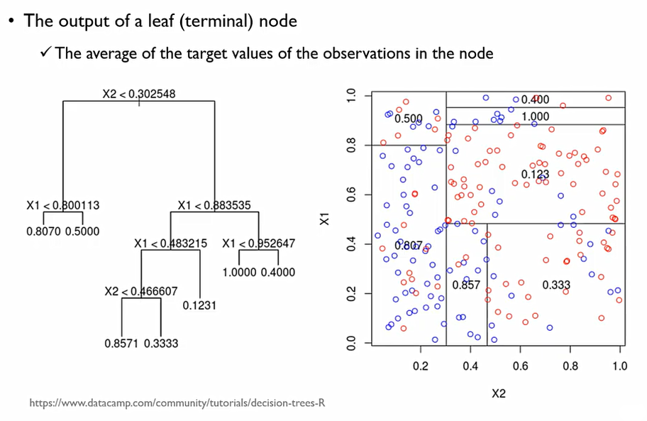 회귀모형에서의 예측값은 해당 영역에 존재하는 객체들의 평균값으로 계산한다.