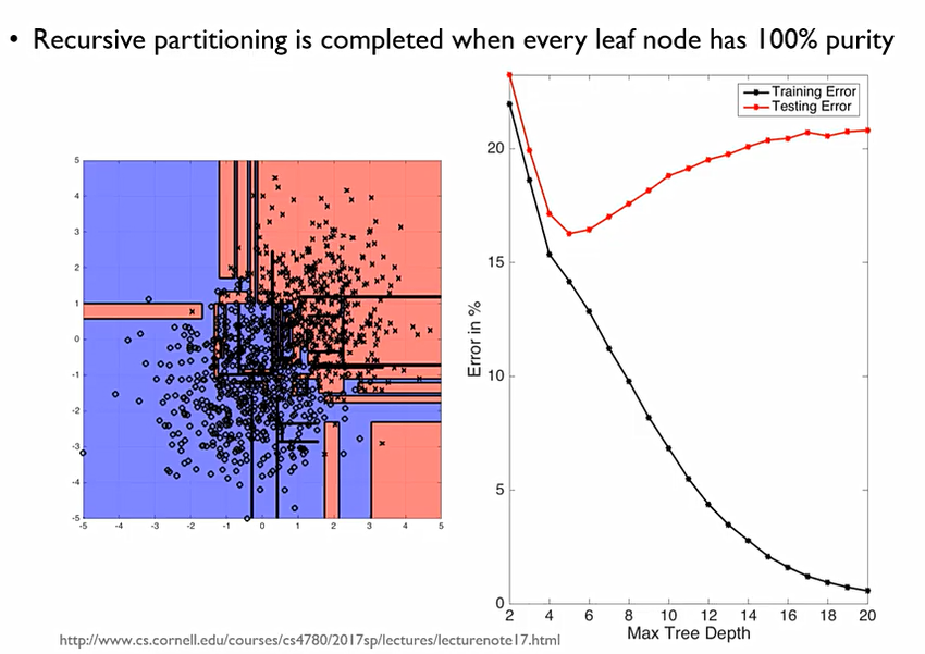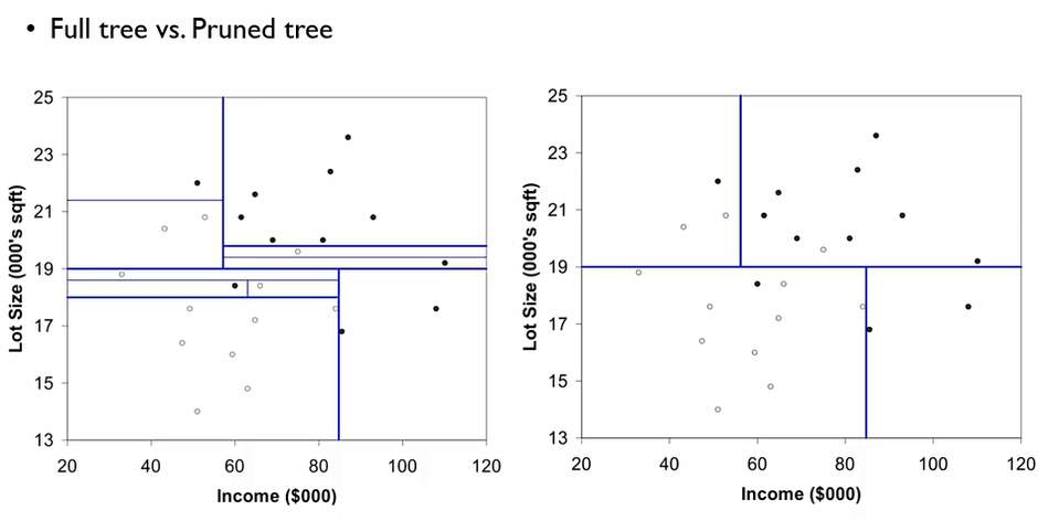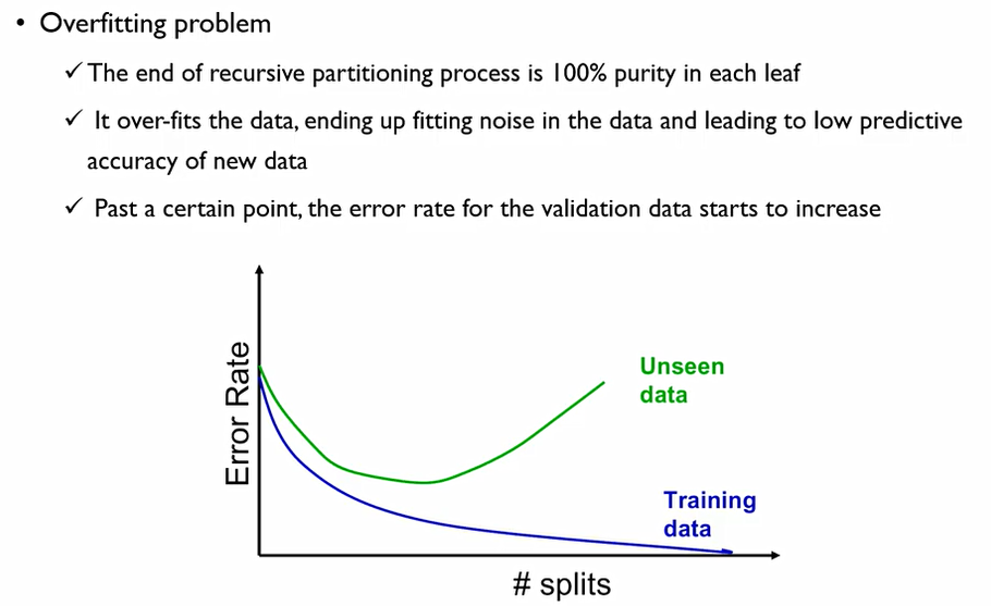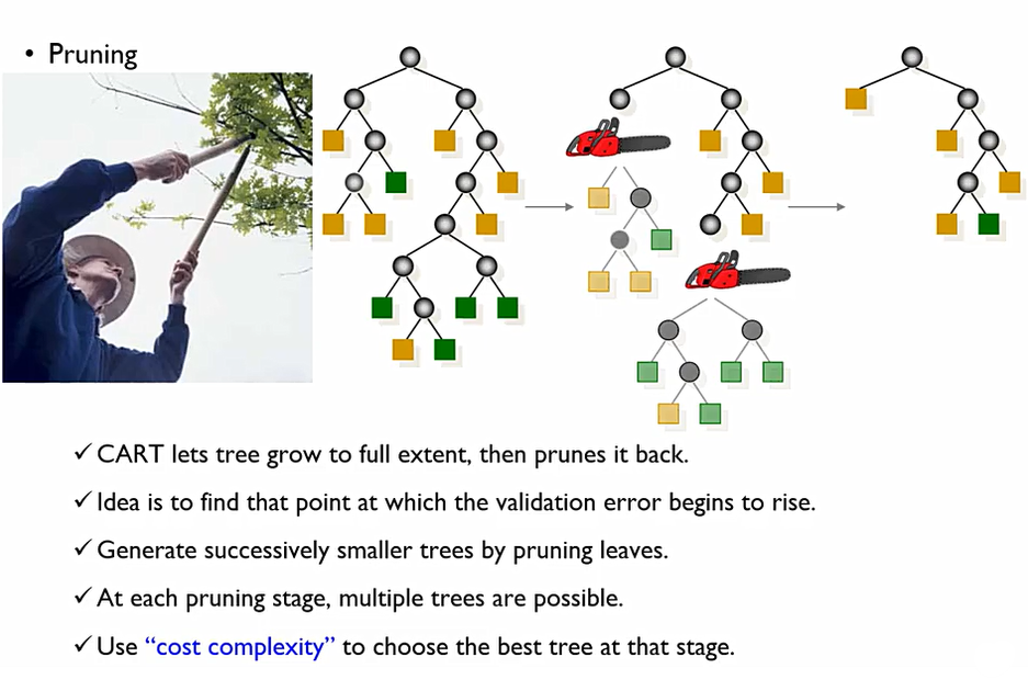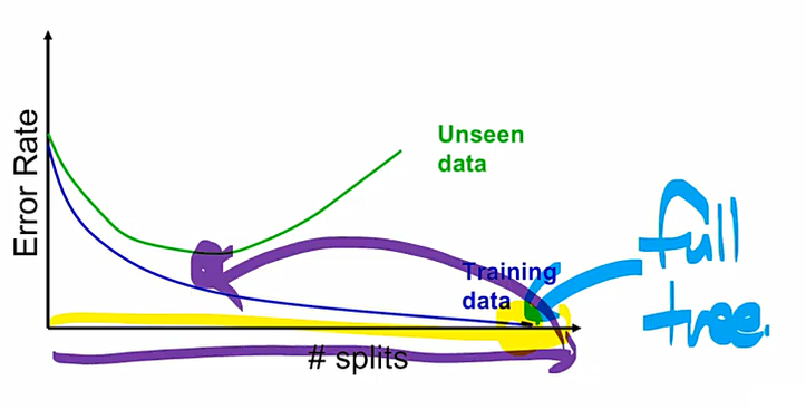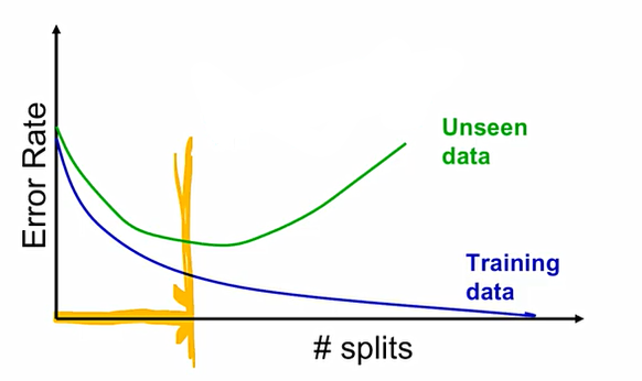 이때, pruning에 대해서는 두 가지 방법이 있다. full tree까지 갔다가 최적점으로 돌아가는 방법인 Post-pruning, 어느 시점까지 가서 unseen data에 대한 성능이 낮아지면 멈춰버리는 pre-pruning이 있다. 대부분 요즘은 pre-pruning을 사용