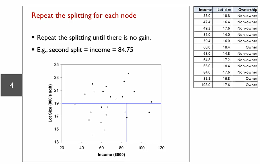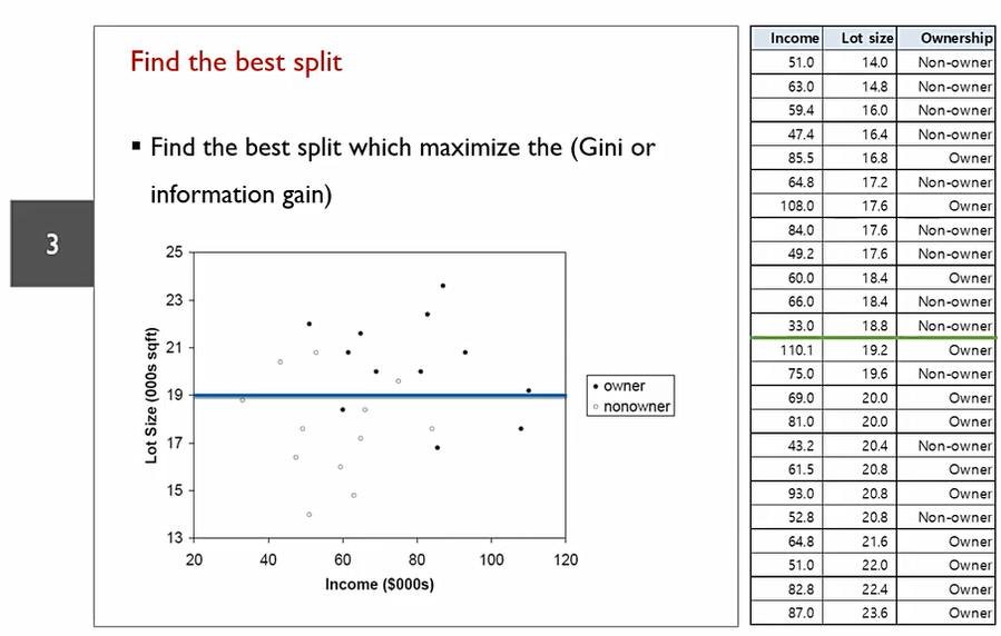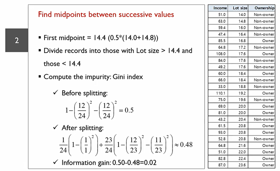 24개의 데이터 point가 있으므로, 중복이 없다는 가정하에 split을 진행한다면 총 23번의 split이 생길 수 있으며, Income에 대해서도 split진행해야 하므로 총 2X23 = 46번의 경우의 수 확인해야한다.