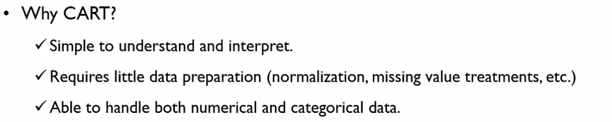 CART(Classification And Regression Tree)는 이해하기 쉽고, 정규화나 결측치가 있어도 잘 돌아가며(현실적이고 유용성이 높다), Numerical하고 Categorical한 데이터가 있어도 한번에 handling할 수 있다.