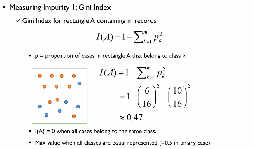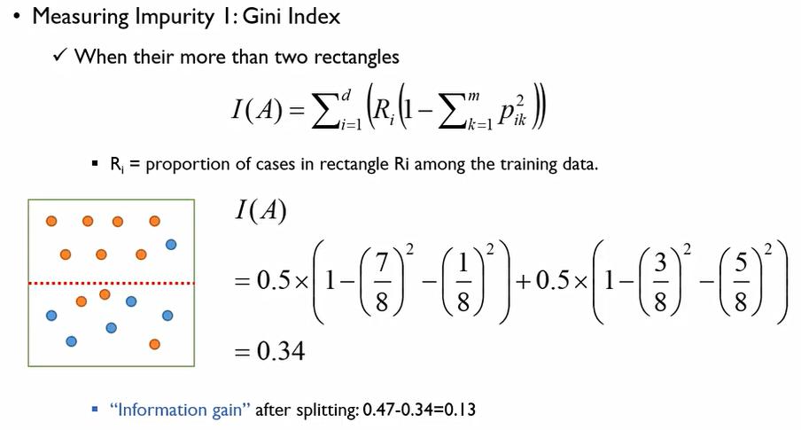 CART에서 사용하는 것은 Gini Index. 이는 A라는 영역에 m개의 class가 있을 때 다음과 같이 계산할 수 있다.