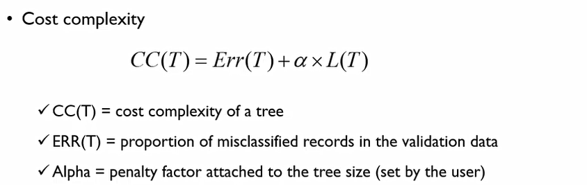 cost complexity(비용 복잡도)는 다음과 같은 두 개의 term으로 구분되어진다. 이때 Err(T)은 Validation data에 대한 오분류된 데이터의 비중을 말하며, L(T)는 Leaf node의 수를 말한다. 이는 즉, 같은 error rate를 가지는 tree라면 더 간단한 트리를 선택하면서 error가 더 낮은 Tree를 선택하겠다라는 것.