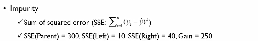 이 경우, impurity는 평균값과 얼마나 멀리 떨어져 있느냐를 계산해야 하기에, SSE를 사용한다.