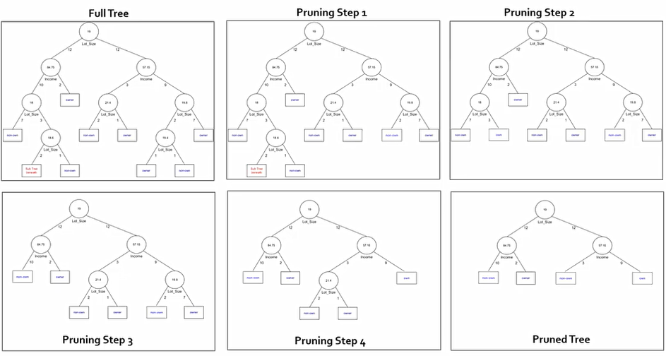 Pruning을 하게 되면, 잘려서 버려지는 node들이 맨 위의 노드에 병합이 되는 개념이라고 볼 수 있다. 이때, pruning의 기준으로는 cost complexity(비용 복잡도)가 있다.