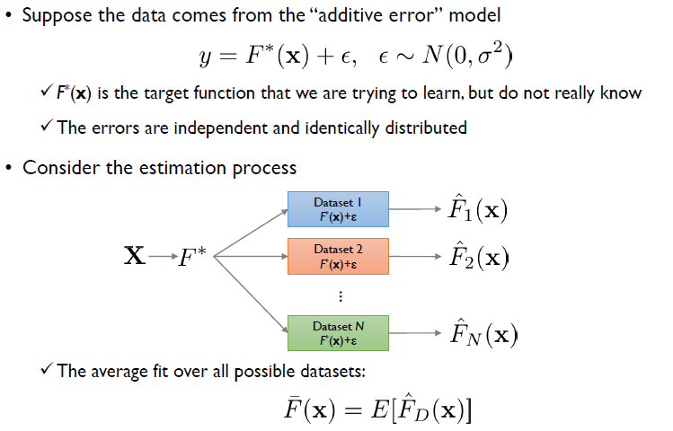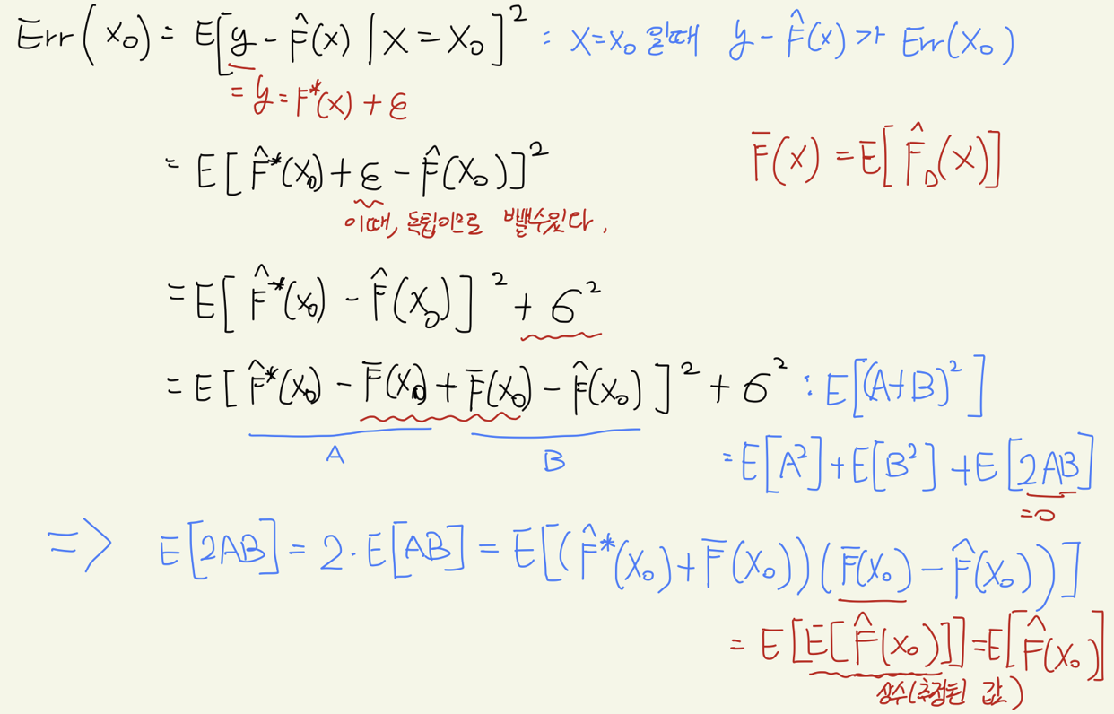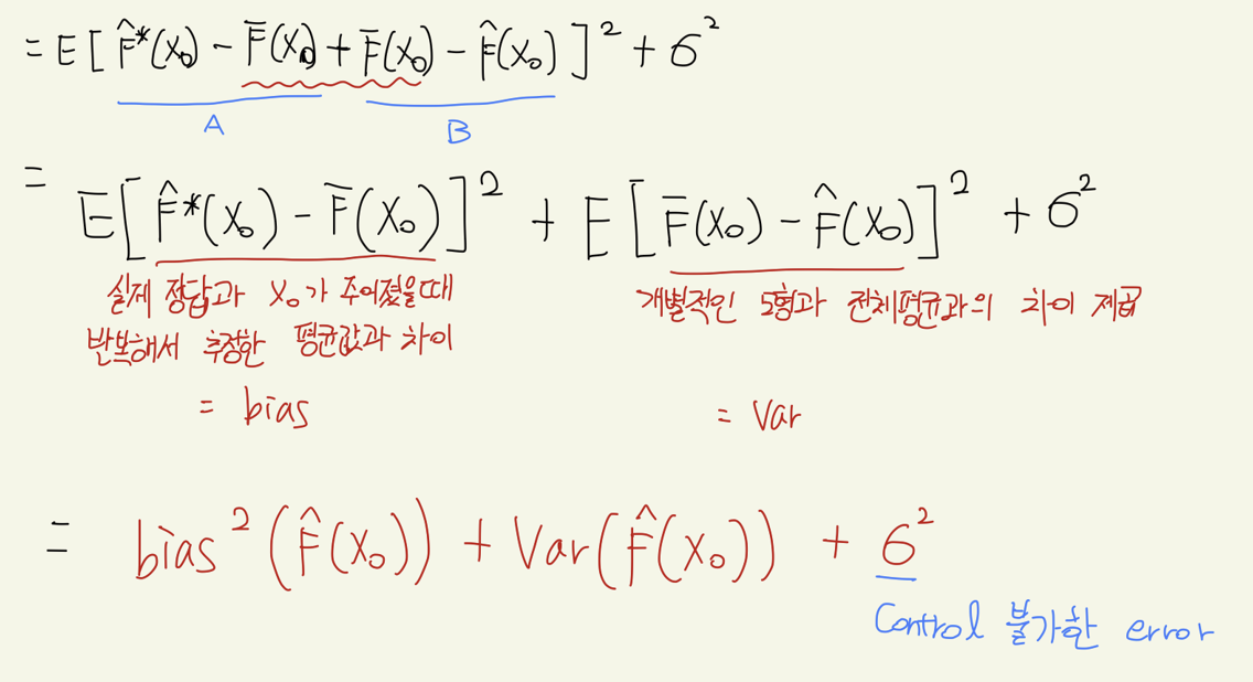 이를 수학적으로 증명해보자. 우리는 먼저 error에 대해 bias와 Variance로 decomposition하여 구분할 수 있다.
