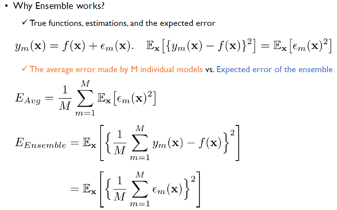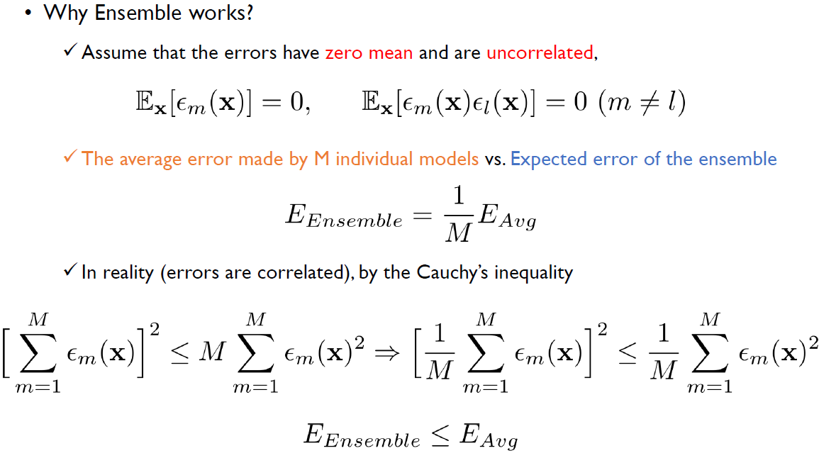 그렇지만, 우리는 앙상블의 에러는 error는 각 개별 모델의 평균보다는 낫다라는 것을 Cauchy's 공식으로 증명할 수 있다.