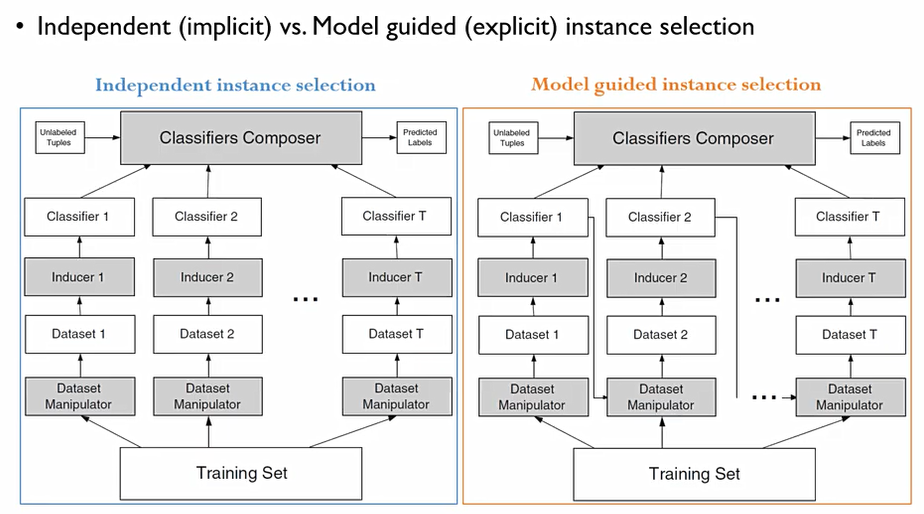 객체를 독립적(independent, implicit)-Bagging으로 만들어내는 과정과 특정 모델의 성과를 보고 (Model guided, explicit)-Boosting 성과로 부터 성과를 보완할 수 있는 데이터셋을 구성하는 방법.