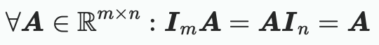 - 단위 행렬:쉽게 말해 어떤 행렬 A가 있을 때, 행렬 곱셈 수행시 자기 자신이 결과로 나오게 하는 행렬을 말합니다.