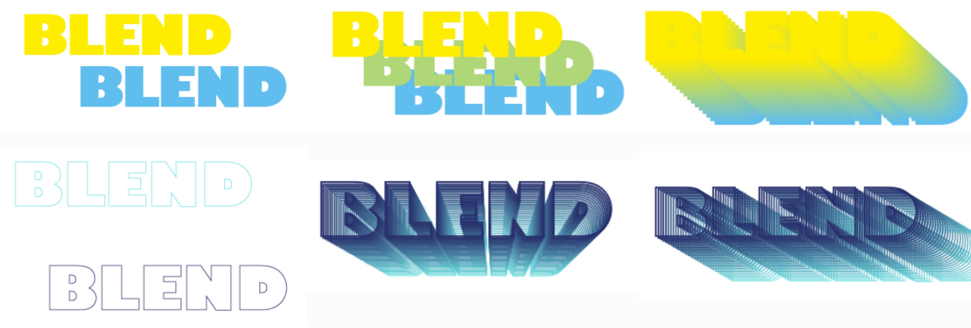 2개의 도형이나 문자를 선택 후 블랜드기능을 적용하면 둘 사이에 수많은 도형이 생겨 그라데이션 효과를 띄며 연결된다.