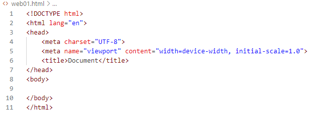 ! + 엔터를 눌러주면 html 기본 양식이 작성된다. html을 사용하려면 꼭 써야하는 기본 구조로 다음과 같이 구성된다.