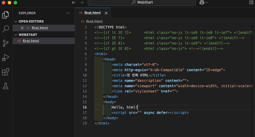 <!DOCTYPE html>와 <html></html>을 만들어 준다.<head></head>와 <body></body>를 만든다.작성하게되면 다음과 같이 작성할 수 있다.