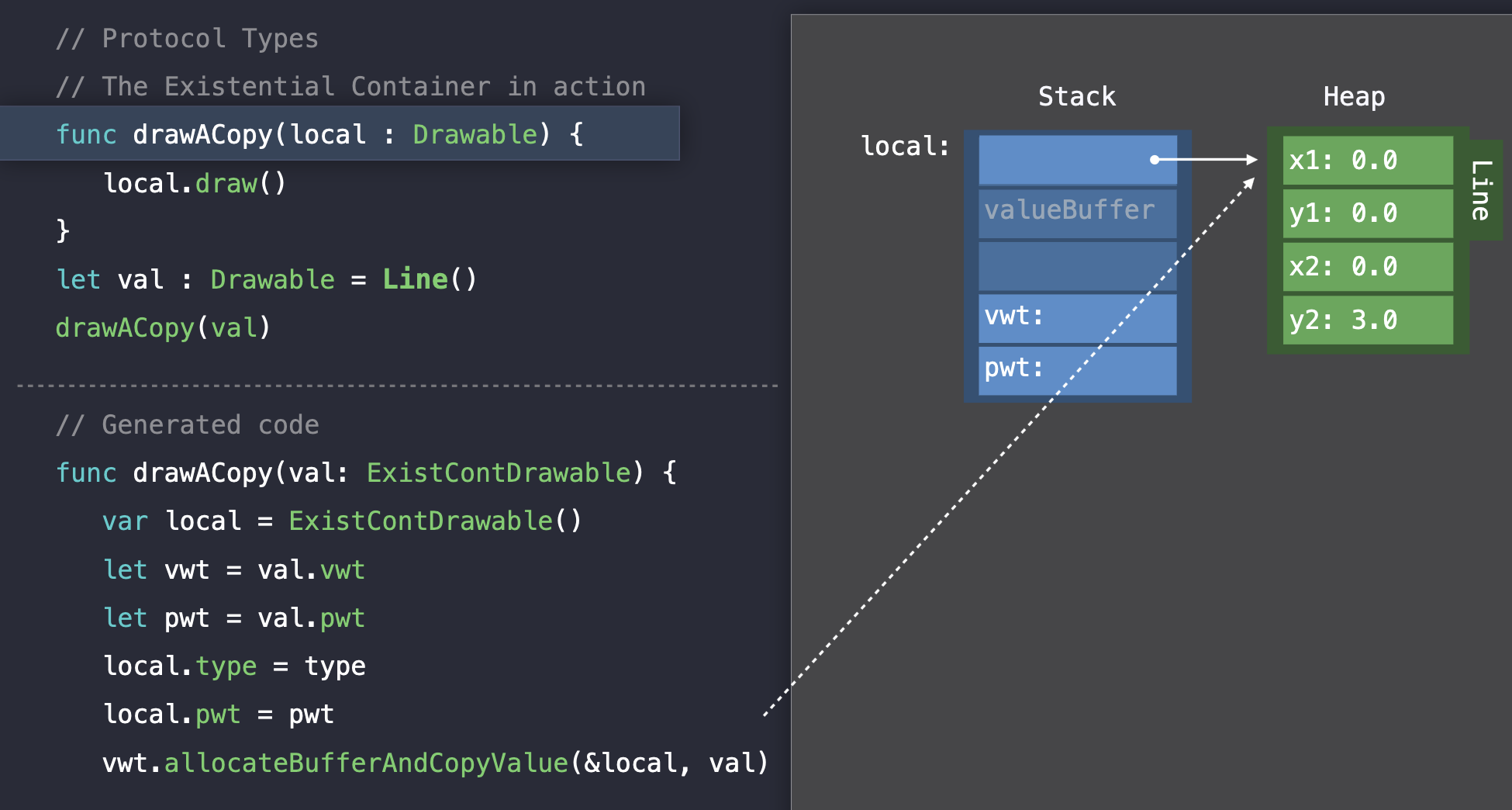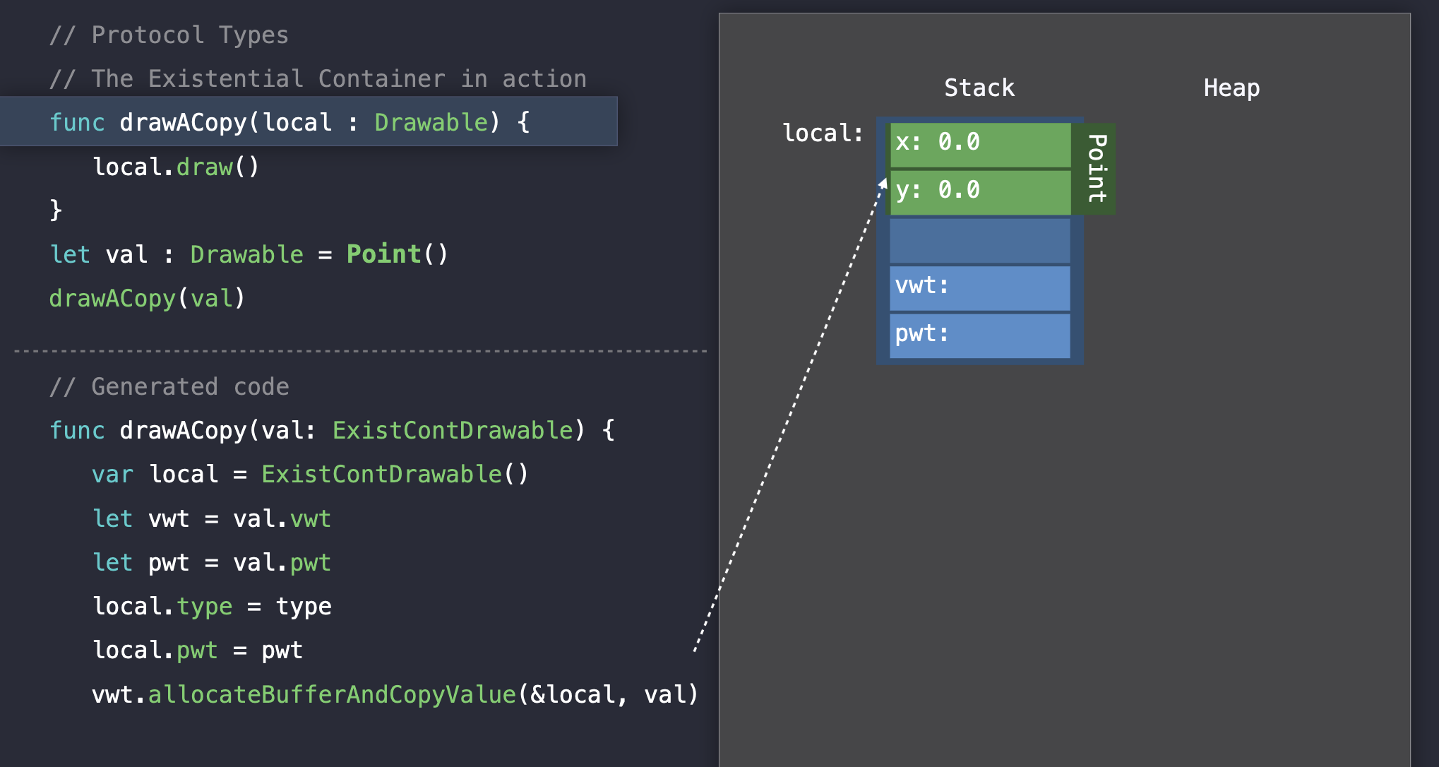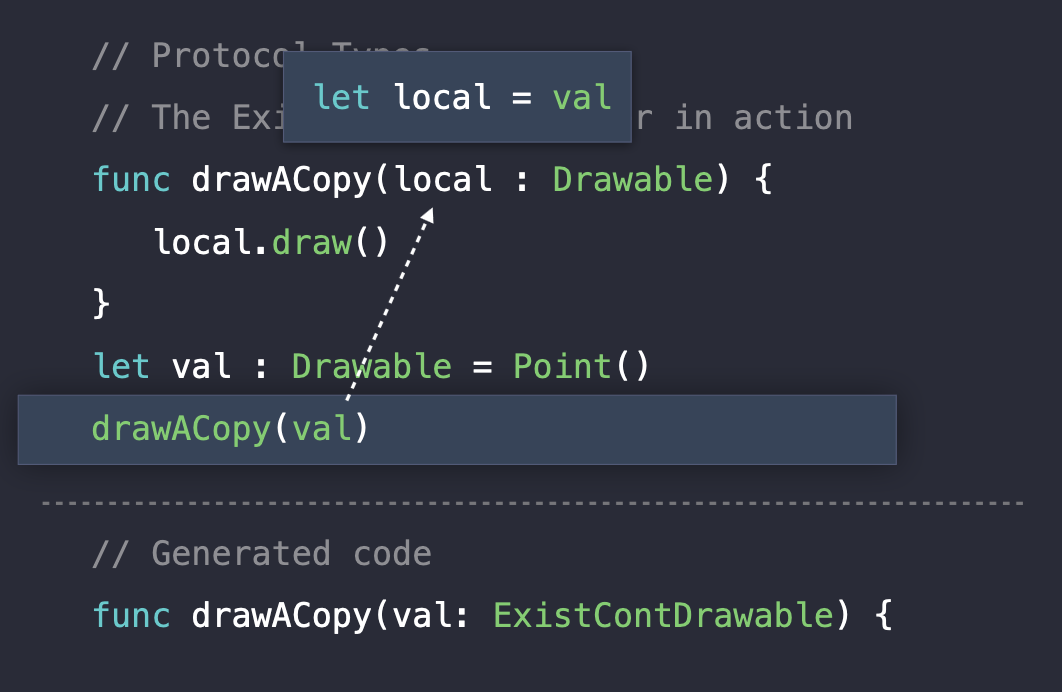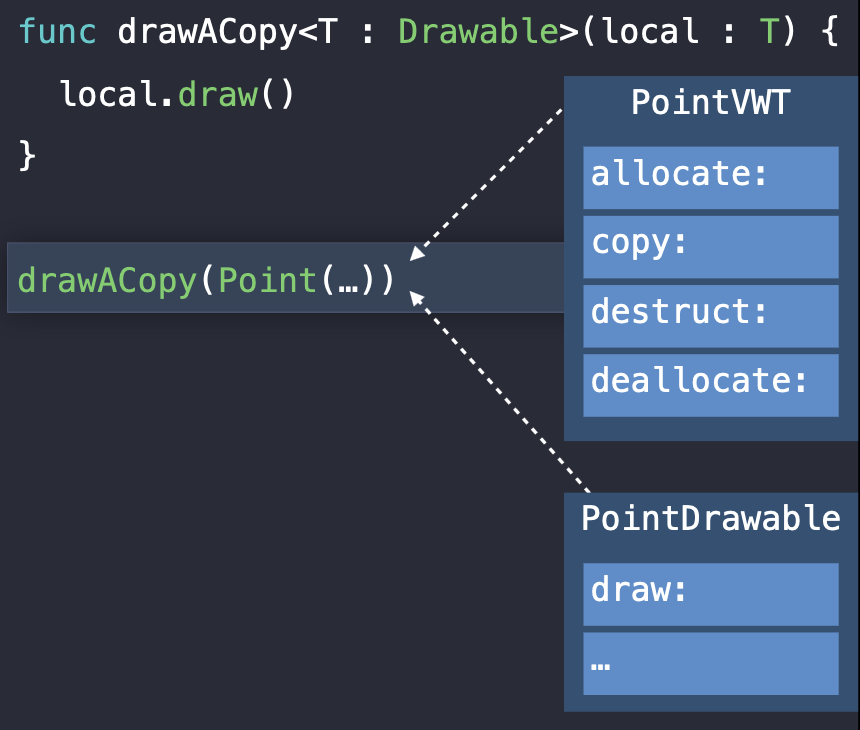drawACopy 함수에 argument의 existential container를 전달한다. 함수가 실행되면 지역변수를 생성하고 거기에 argument를 할당한다.