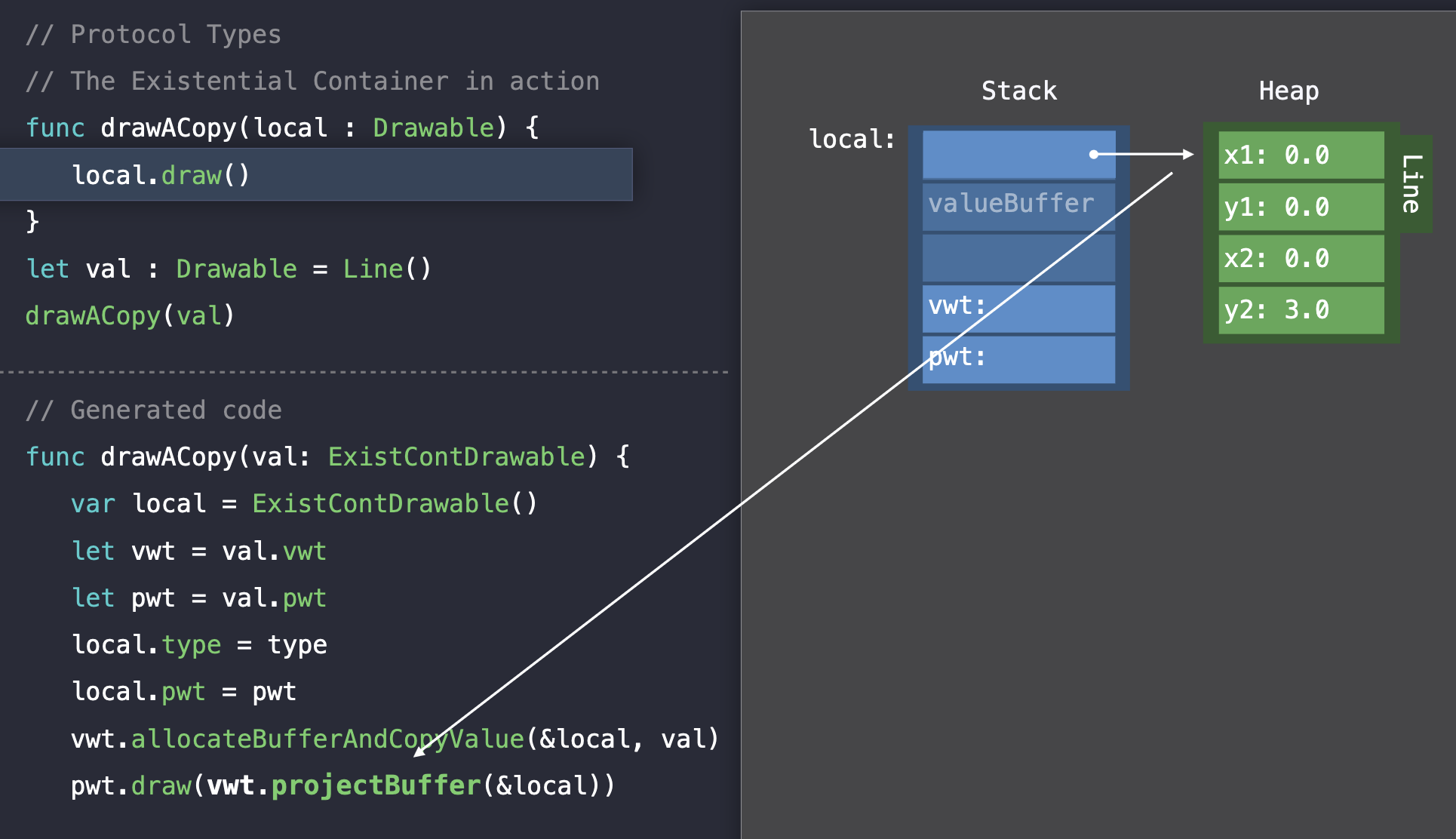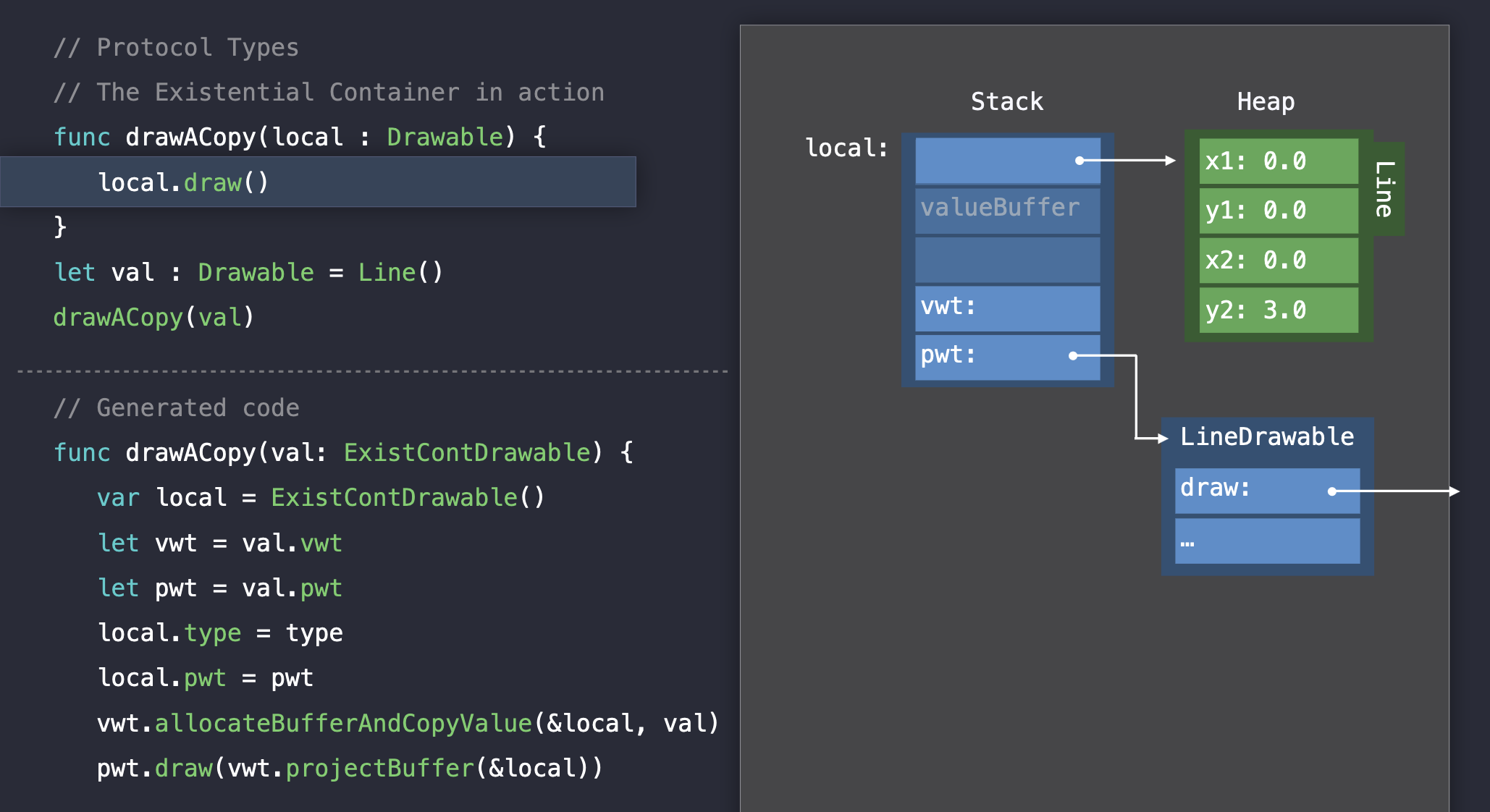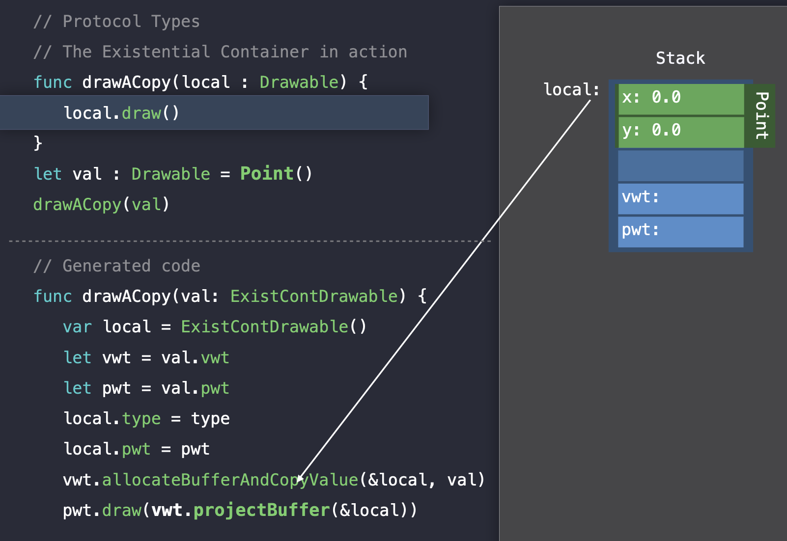 drawACopy 함수에 argument의 existential container를 전달한다. 함수가 실행되면 지역변수를 생성하고 거기에 argument를 할당한다.