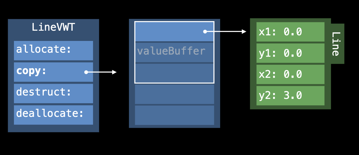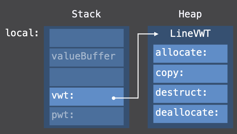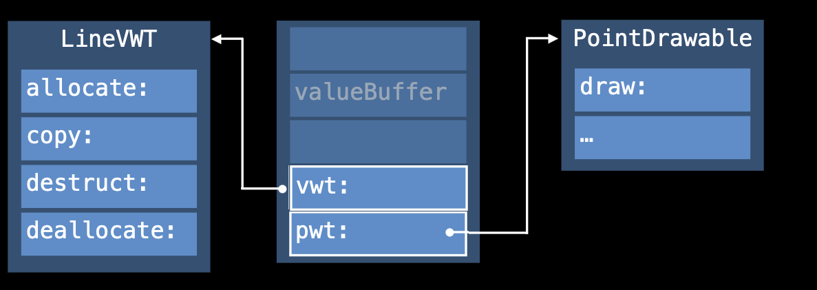 existential container는 이러한 차이에 맞게 관리해야 하는데, 이를 테이블 기반 메커니즘인 Value Witness Table를 통해 관리한다.