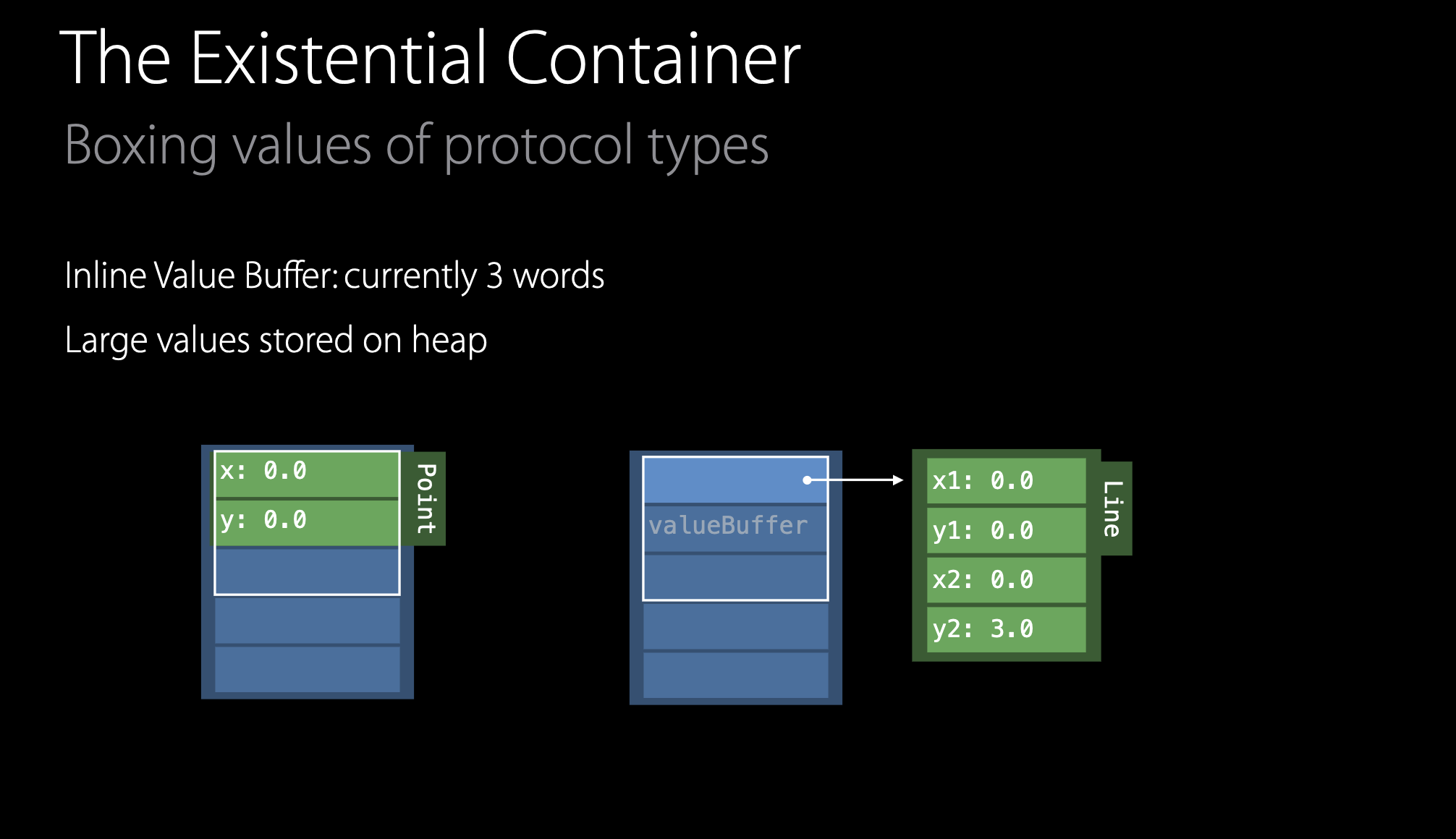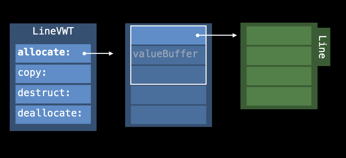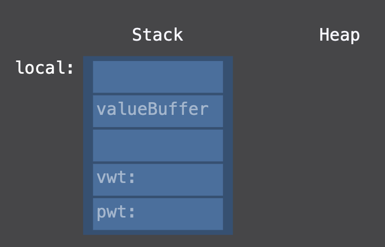allocate 함수를 호출 힙에 메모리를 할당한 후, 해당 메모리에 대한 포인터를 existential container의 value buffer에 저장한다.