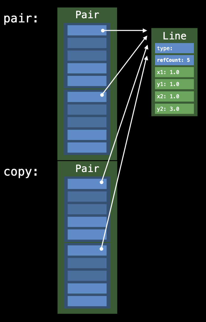 방안 1. 두번째 필드에 대해서 첫번째 참조를 복사하면 heap을 할당하지 않고 reference counting만 증가해도 된다.