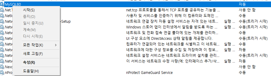 mysql80 시작 하고 cmd 에서 mysqpl 정상적으로 접속 성공 하였다.