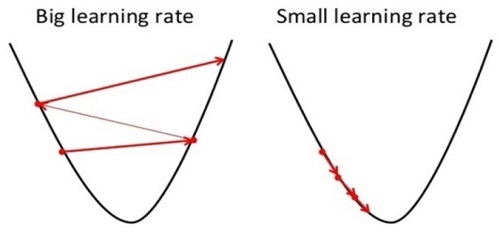 Learning Rate가 너무 작으면 수렴하는데에 오래걸리는 문제가 생기고, 너무 크면 최소값에 이르지 못해 수렴하지 못하거나 심지어 발산하는 문제가 발생할 수 있다. 그러므로 적절한 learning rate을 고르는 것이 중요하다.