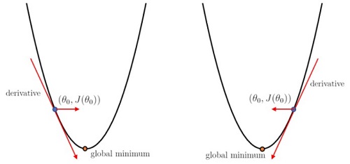 편미분항 ∂ ∂ θ j J ( θ 0 , θ 1 ) {\partial \over \partial\theta_j}J(\theta_0, \theta_1) ∂ θ j ∂ J ( θ 0 , θ 1 ) 이 양수이면 왼쪽으로, 음수이면 오른쪽으로 움직여 Cost를 줄여나간다.