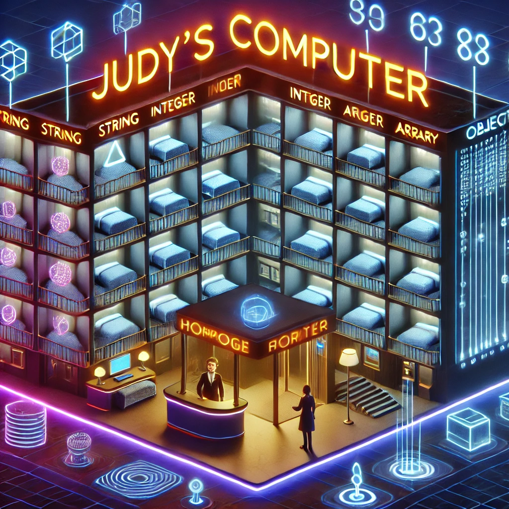 거기서 나는 1020호실에 String이라는 형태로 투숙하는 "Hello"이다. 그리고 1020호실은 변수명(방 키) hi와 연결되어 있다.