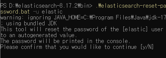 그렇다면 반드시 엘라스틱 서치가 실행되는 상태로 새 창을 열고 .\elasticsearch-reset-password.bat -u elastic