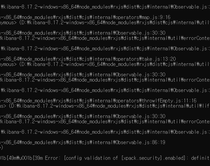 Aㅏ... 알고보니 보안 설정을 끄려고 따로 키바나 yml 파일에 보안설정 코드를 적었다가 그게 인식이 되어서 문제였던 거였다. 브아보