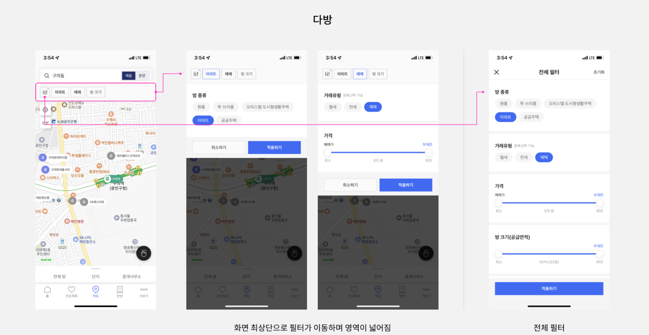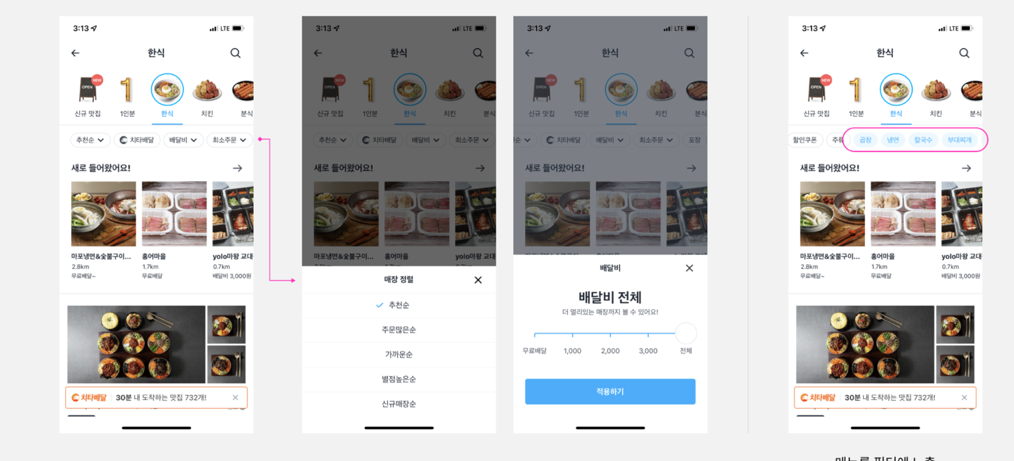 원하느 필터를 선택하면 해당 필터가 하단에 나타나면서 화면 전체를 덮지 않아 사용자는 부담스럽지 않다.