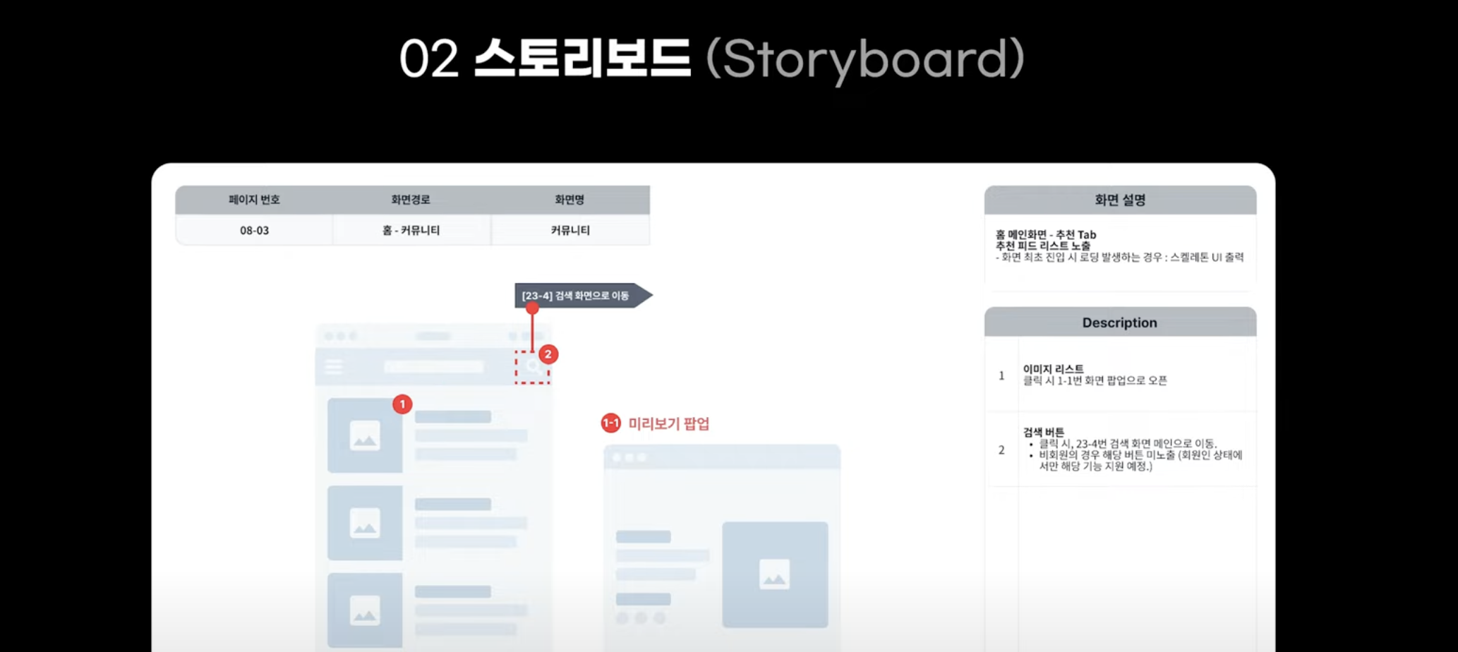 스토리보드-웹페이지의 시각적 디자인을 나타내는데 사용. 디자인과 개발 상황들을 상세히 기입한 내용.