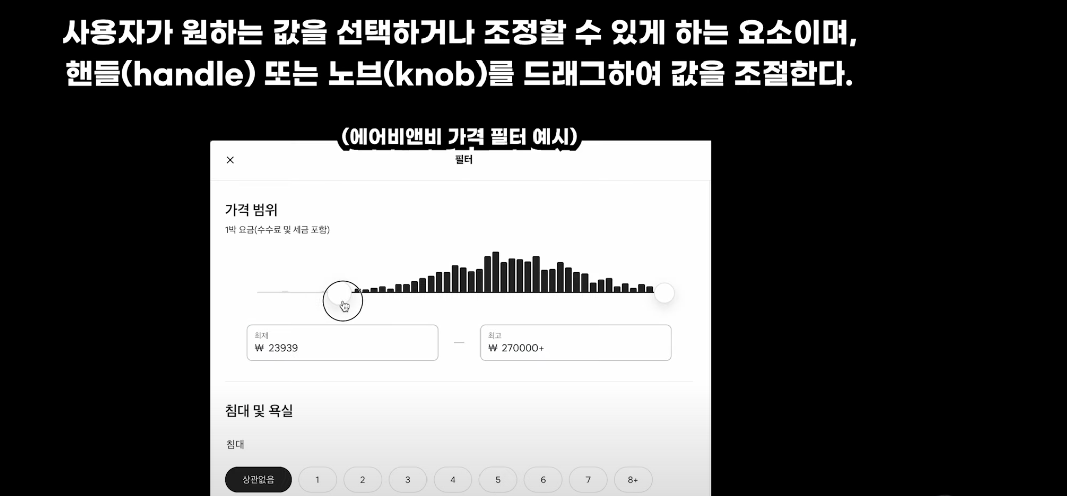더 사용자가 원하는 값을 조정할 수 있도록 핸들이나 노브를 드래그하여 값을 조절한다. 슬라이더는 대략적인 값을 입력할때 사용한다.