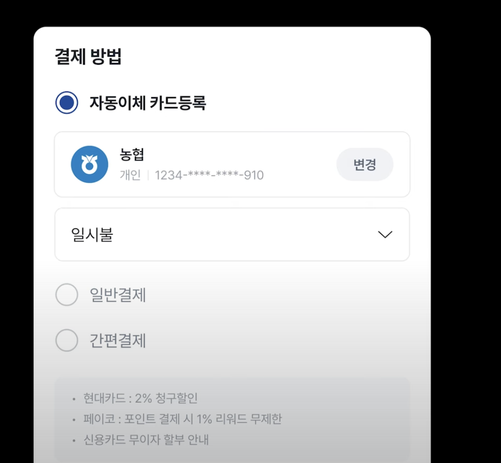 성별선택, 결제방식등 반드시 한가지를 선택해야 한다.