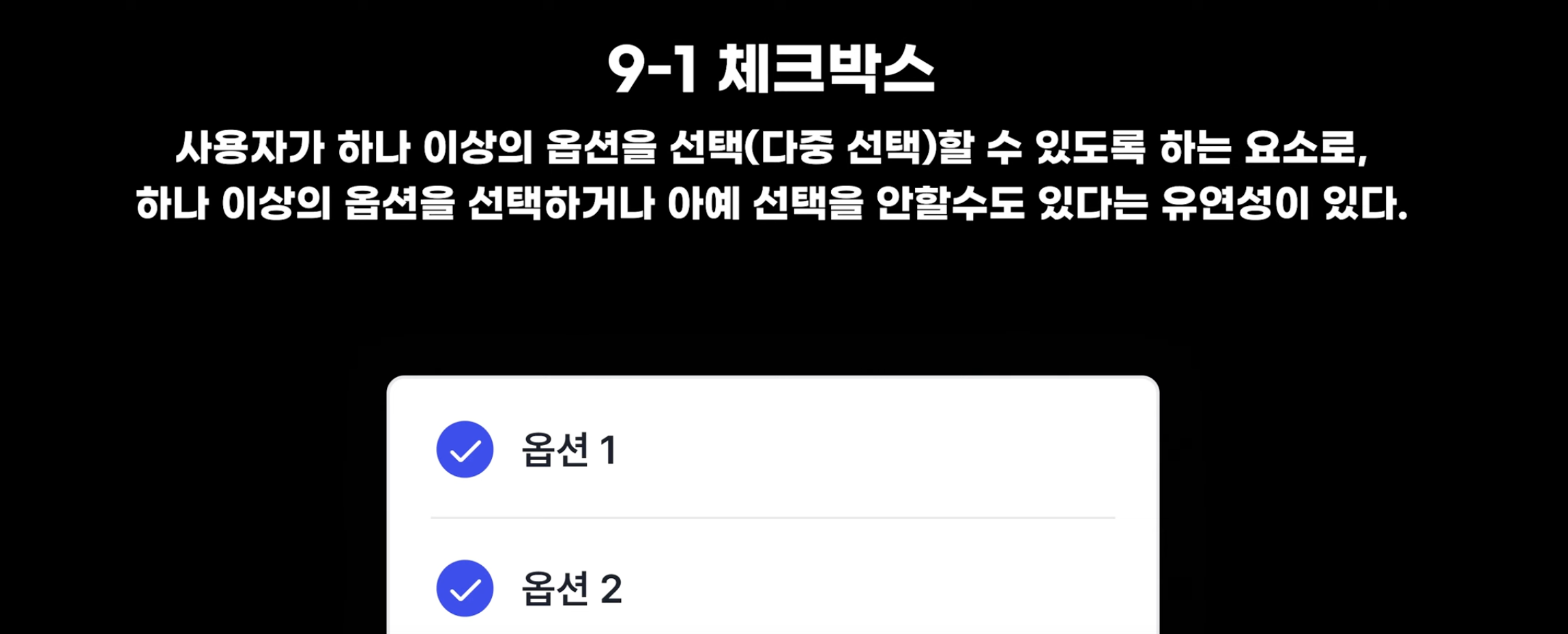 동의여부나 다양한 관심사를 선택할 때 사용된다. 반드시 선택을 하지 않을때도 존재한다.