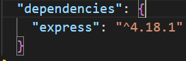 우리가 다운받은 모듈들은 모두 package.json 파일 안에 dependencies라는 객체 안에 등록되는데, 필자는 이미 express라는 모듈을 다운받았기 때문에 아래와 같이 express와 그 버전이 등록되어 있는 걸 볼 수 있다.