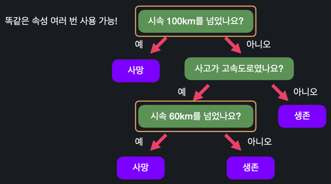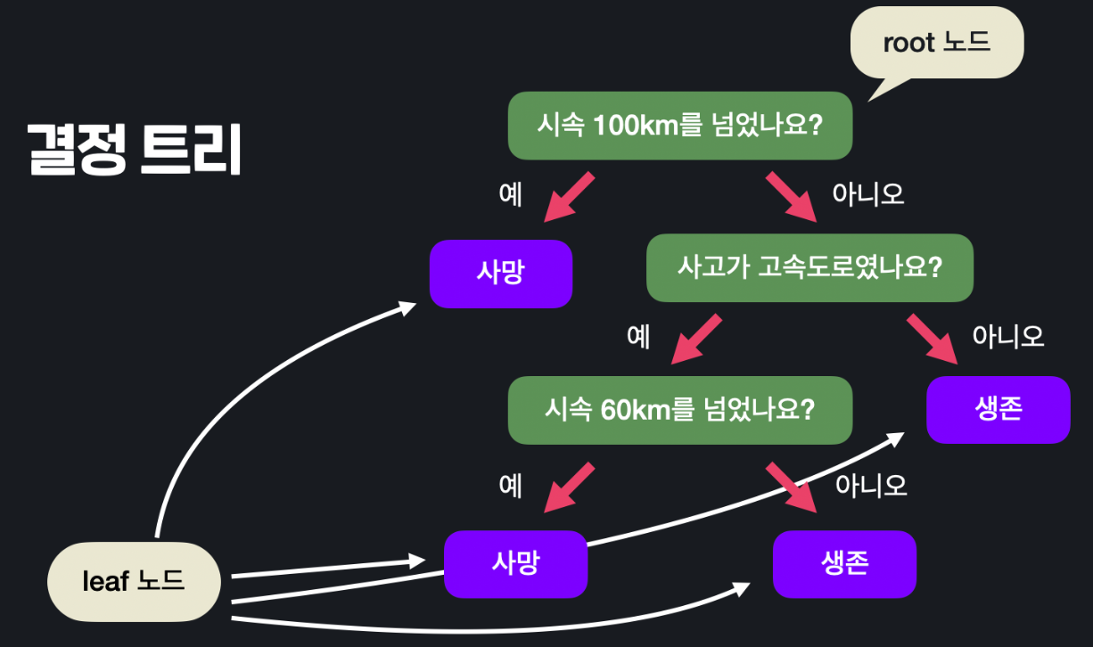 ์๋ฅผ ๋ค์ด ๊ตํต์ฌ๊ณ ๊ฐ ๋ฌ์ ๋, ์ด์ ์์ ์์กด ์ฌ๋ถ๋ฅผ ์์ธกํ๊ณ ์ถ๋ค๊ณ ํ์. ๊ทธ๋ฌ๋ฉด ๊ฒฐ์ ํธ๋ฆฌ๋ ๋ค์๊ณผ ๊ฐ์ ์ ์๋ค.