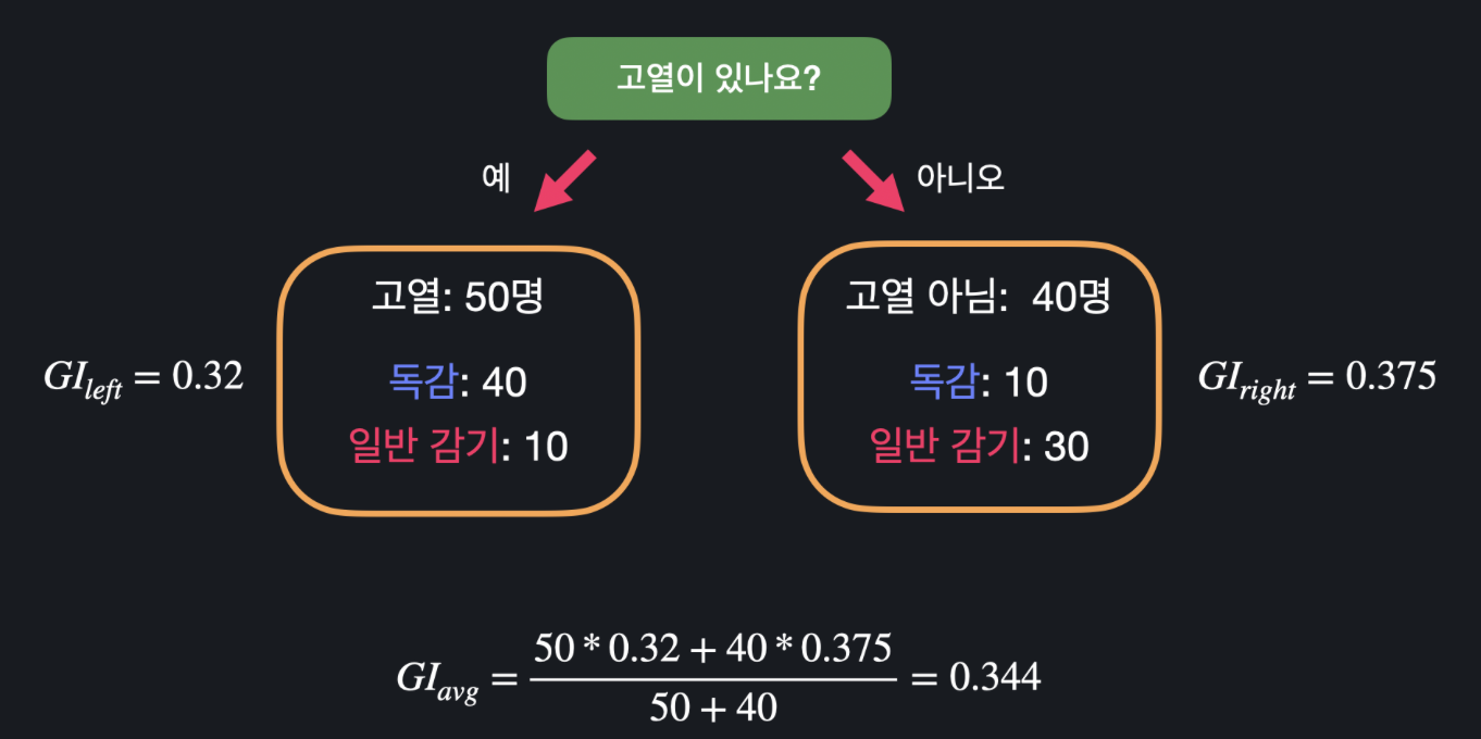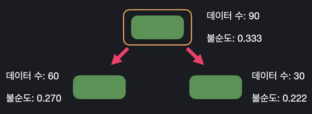 ๋ถ๋ฅ ๋ ธ๋๋ฅผ ํ์ ๋ ์ต๋ํ ๋ง์ ๋ฐ์ดํฐ๋ฅผ ๋ง๊ฒ ๋ถ๋ฅํด์ผ ์ข์ ๊ฒ์ด๋ค. ๊ทธ ๋ง์ ์ฌ๊ธฐ ์๋ ๋ชจ๋ ๋ฐ์ดํฐ 90๊ฐ๋ฅผ ํ๋์ ๋ถ๋ฅ(๋ ๊ฐ or ์ผ๋ฐ ๊ฐ๊ธฐ)๋ก ์์ธก์ ํ์ ๋, ์ต๋ํ ๋ง์ด ๋ง์์ผ ๋๋ค๋ ๊ฒ์ด๋ค.