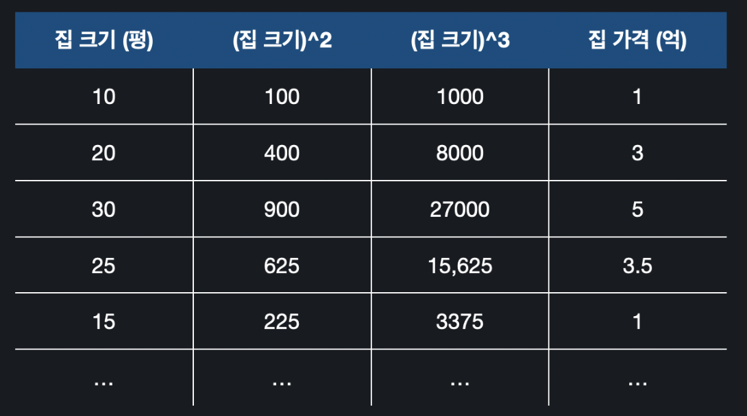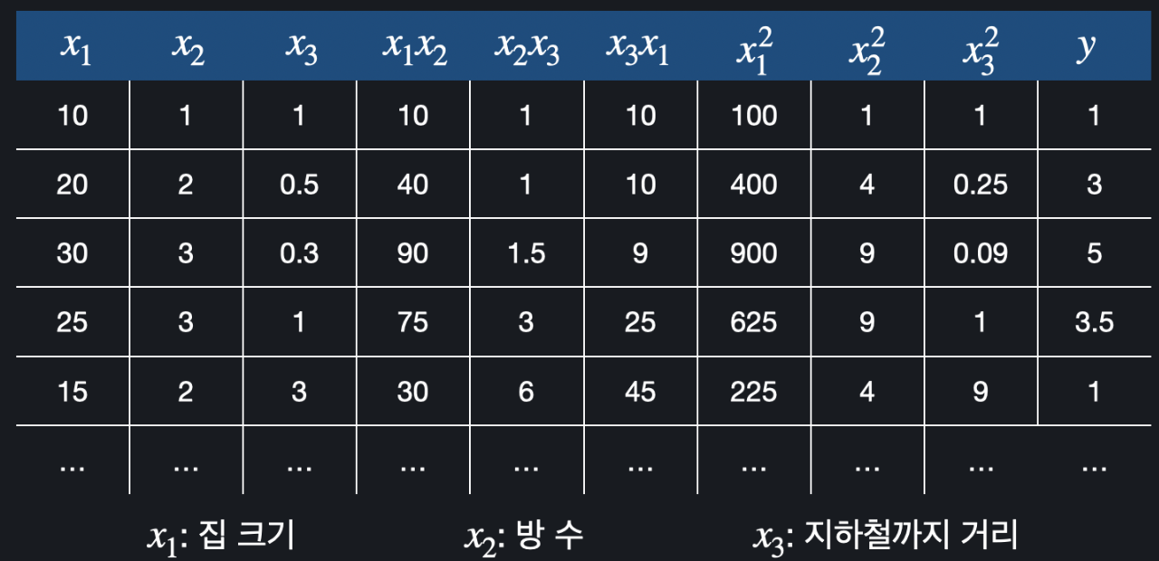 일단 가설 함수의 최대 차수가 2차이기 때문에 기존의 집 크기(), 방 수(), 지하철까지 거리()들로 만들 수 있는 모든 이차항을 알아내면 된다.