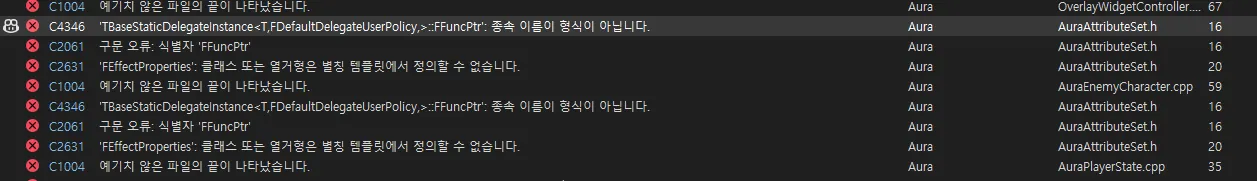 직접 typename 없이 빌드를 시도해봤더니, 약 30초 정도 빌드 대기를 하다가 “ 'TBaseStaticDelegateInstance<T,FDefaultDelegateUserPolicy,>::FFuncPtr': 종속 이름이 형식이 아닙니다.”라는 위와 같은 오류가 잔뜩 출력되고 빌드가 실패하는 모습을 볼 수 있었다.