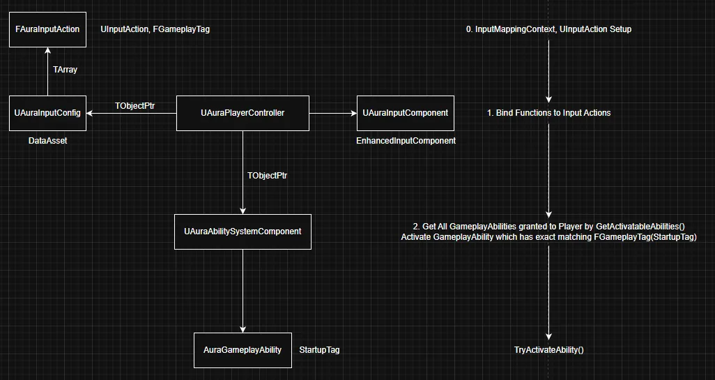 따라서, AuraPlayerController는 AuraAbilitySystemComponent에 대한 참조, AuraInputConfig에 대한 참조 (에디터 내에서 설정 가능하도록)를 지녀야 하며, 입력 액션 바인딩을 통해 AbilitySystemComponent가 입력 액션과 쌍을 이루는 FGameplayTag을 지닌 GameplayAbility를 사용하는 함수를 정의해야 함.