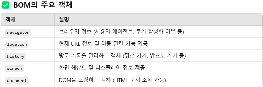 DOM이 HTML 문서를 조작하는 역할을 한다면, BOM은 브라우저 자체를 조작하는 역할