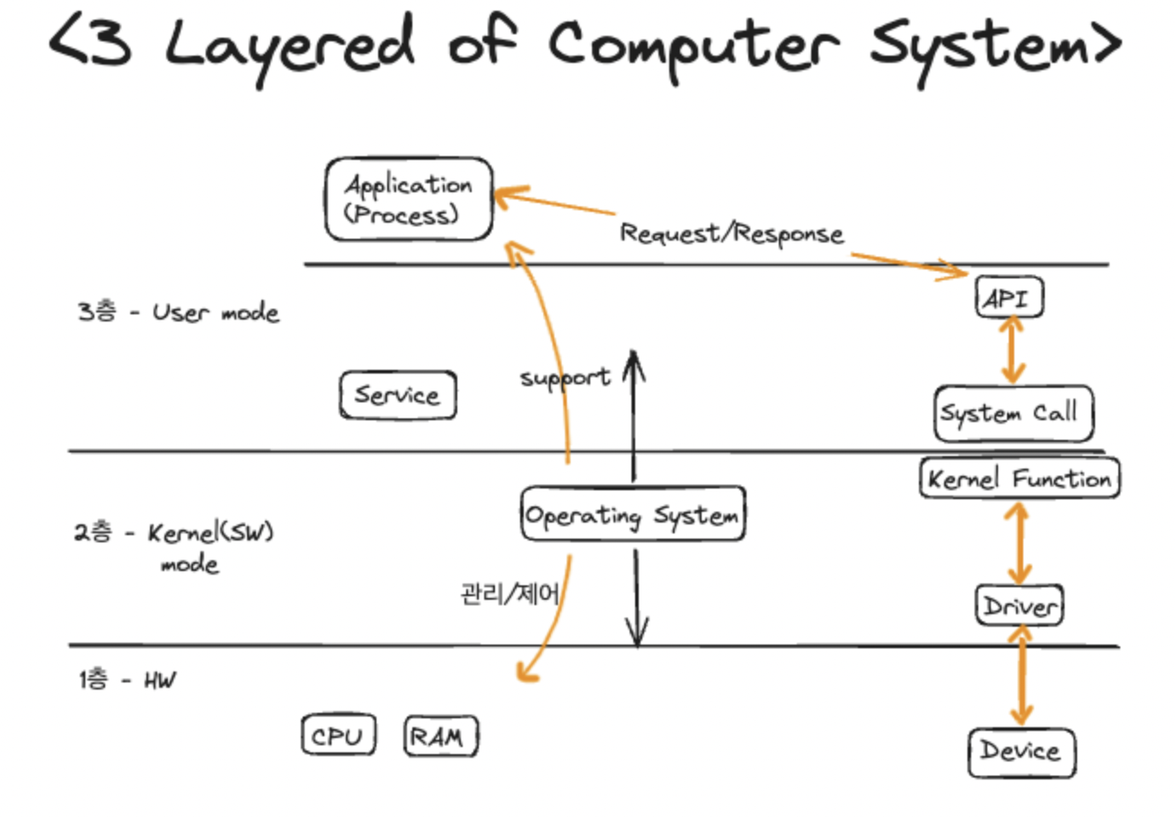 Looking at the structure of a computer, I had a question when seeing the separation between the user and kernel parts. I wondered why we need to manage hardware through system calls, as it seems inefficient when everything could just be controlled and managed in a single layer.