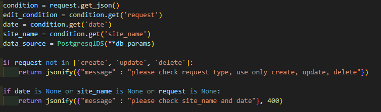 request에서 던진 json을 변수에 받아 해당 json 내부의 데이터를 쓸 때 condition['condition'] 식으로 받아올 경우 해당 데이터가 없으면 keyError를 날린다.