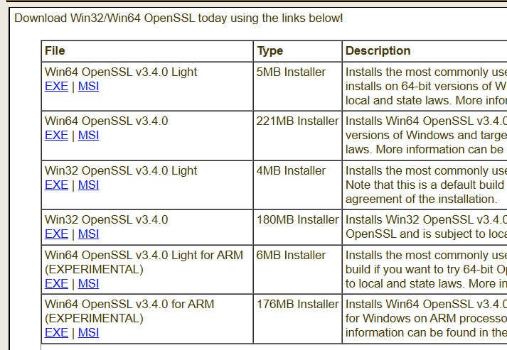 나는 가장 최신 버전으로 Win64 OpenSSL v3.4.0을 받았다.